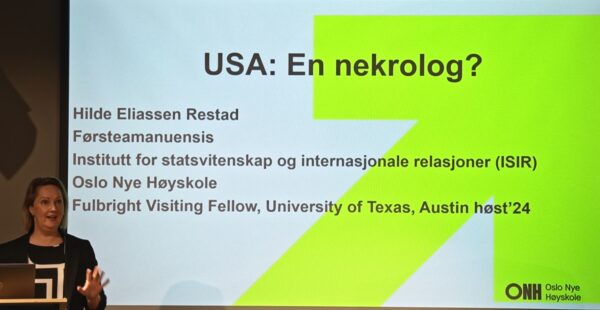 -USA oppfyller ikke lenger kravene som stilles for at et land kan kalles et liberalt demokrati. Det slo førsteamanuensis Hilde Restad fast da hun foreleste for et fullsatt medlemsmøte i FSU 5. november. Hun konstaterte at det amerikanske demokratiet har gjennomgått en rask tilbakegang siden Donald Trump overtok som president