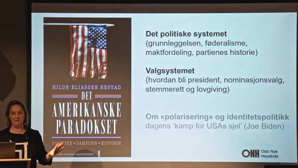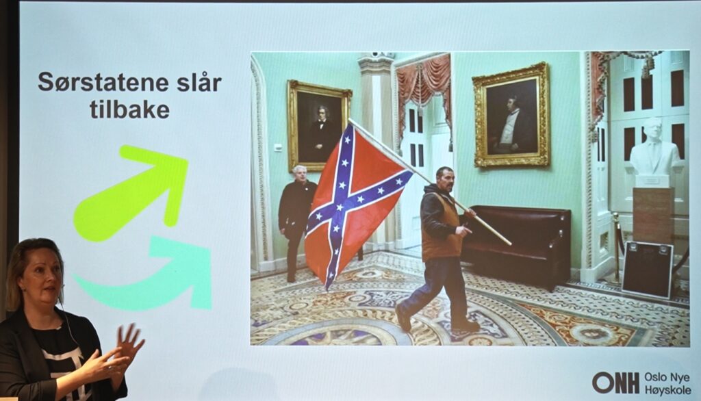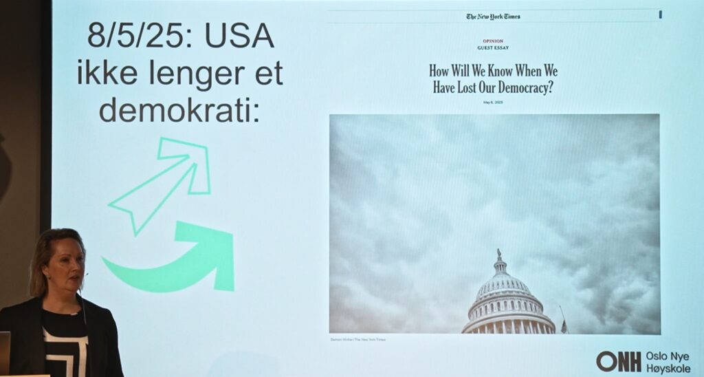 -USA oppfyller ikke lenger kravene som stilles for at et land kan kalles et liberalt demokrati. Det slo førsteamanuensis Hilde Restad fast da hun foreleste for et fullsatt medlemsmøte i FSU 5. november. Hun konstaterte at det amerikanske demokratiet har gjennomgått en rask tilbakegang siden Donald Trump overtok som president 20. januar i år.