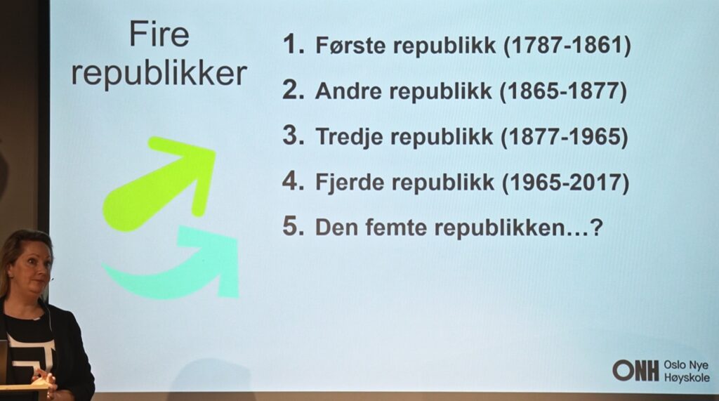 USA var i 1776 verdens første moderne demokratiske republikk. Mens det er bred enighet om at Frankrike har hatt fem republikker siden sin revolusjon, har det ikke vært vanlig med en tilsvarende oppdeling i USA. Restad hevdet imidlertid at USAs historie er mer lik Frankrikes enn amerikanerne ønsker å tro.