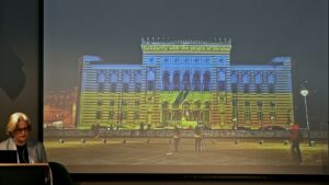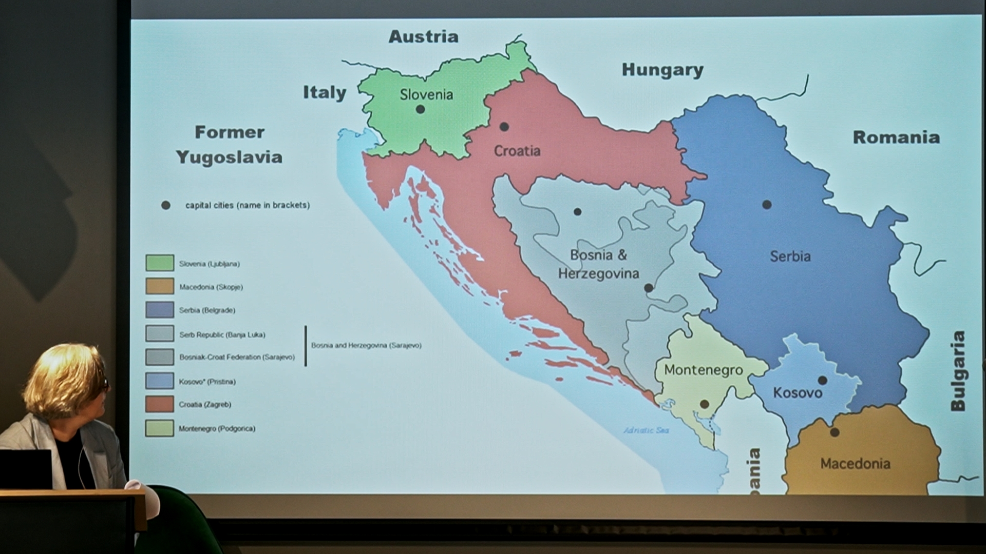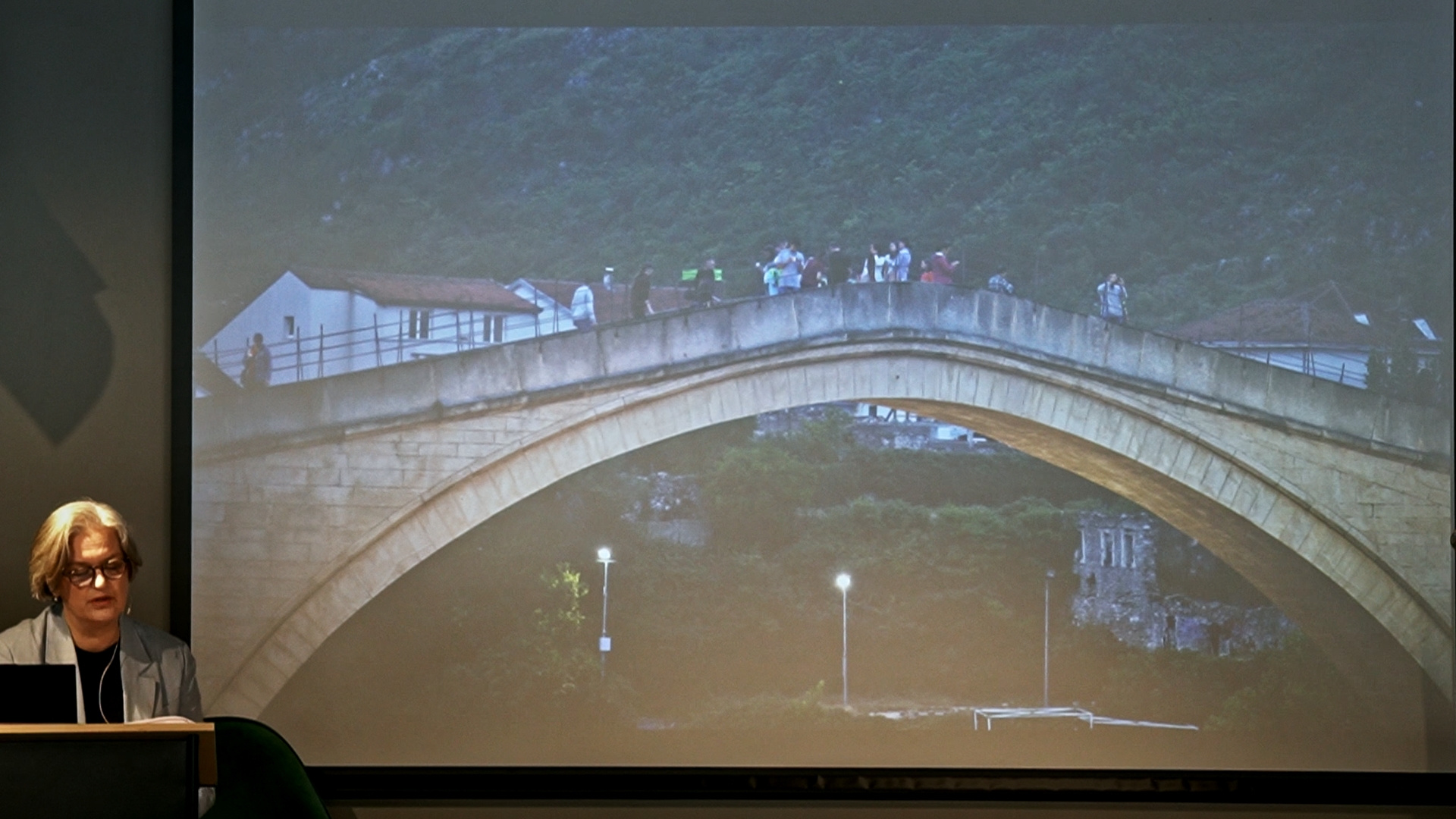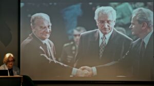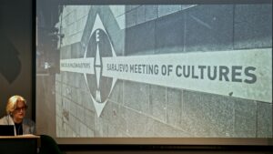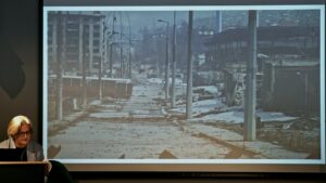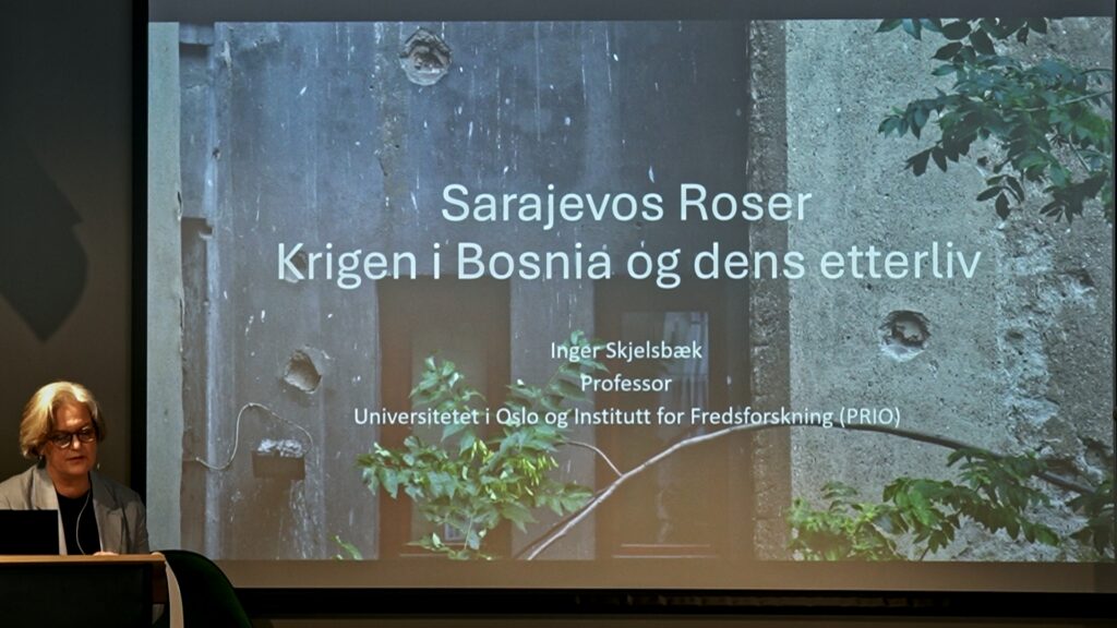 Beleiringen av Sarajevo varte under hele krigen, fra 1992 til 1995. Det er den lengste beleiringen i moderne europeisk krigshistorie. I byens gater er det den dag i dag rødmalte minnesmerker på steder der mennesker ble drept. Disse minnesmerkene kalles Sarajevos roser. Dette er også tittelen på Inger Skjelsbæks bok etter studieturene til Bosnia. Hun sa i foredraget at Sarajevos roser ikke bare er til for å hedre de døde, men også for å minne om og advare mot at grusomheter kan skje igjen.
